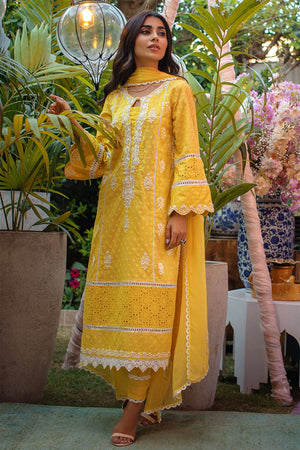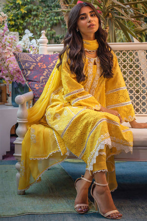Pineapple yellow schiffli kurta with white embellishments paired with pants and a chiffon block printed dupatta.Collection: Ramadan Edit