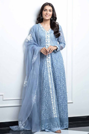 Maya Blue Chikankari front open kalidar with white sleek embellishments, paired with straight pants and a sheer embroidered organza dupatta.Collection: New Arrivals