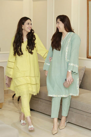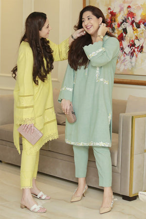 Caribbean green karandi kurta with pastel embroidered trellises, paired with matching pants.Fabric: Karandi