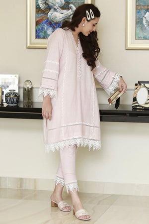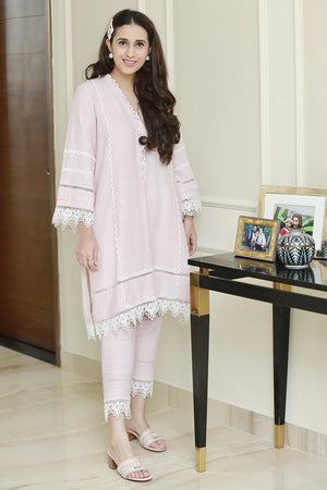 Powder pink karandi kurta with pearl white laces, paired with matching pants.Fabric: Karandi