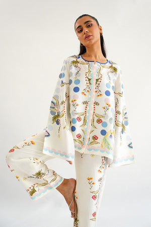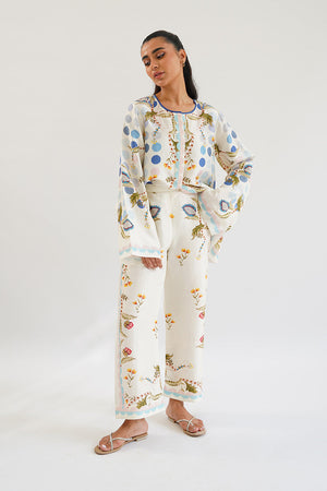 All you need on your summer holidays is a light ivory rawsilk co-ord set adorned with a refreshing botanical print. Put it on and immerse yourself in the functional flair with billowing sleeves.