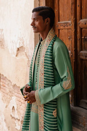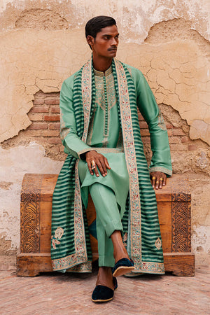 Ensemble ‘Alamgir’ from the 'Raag Darbari' collection, presented in a serene shade of ocean jade, captures the timeless elegance of Mughal artistry. The raw silk kurta and trousers are richly embellished with resham thread embroidery and baddla metallic accents, featuring elongated paisleys and intricate jharoka motifs. With embroidery extending across the chest and sleeves, the look is completed by a self-organza shawl adorned with block-printed Mughal designs and kachi embroidery,
