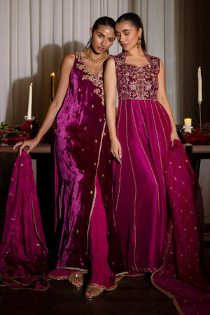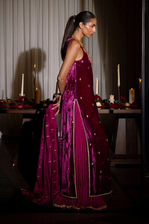 Elevate your evening ensemble with this exquisite angharka. Crafted from velvet the long silhouette features a captivating V-neckline adorned with intricate cutwork detailing. A keyhole back adds a touch of sensuality, while the lavish embellishments of sequin, tikki stone cut dana, and gota work exude timeless elegance.
