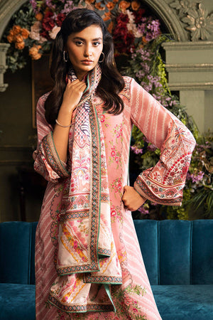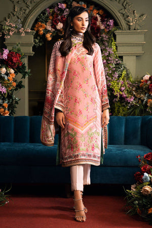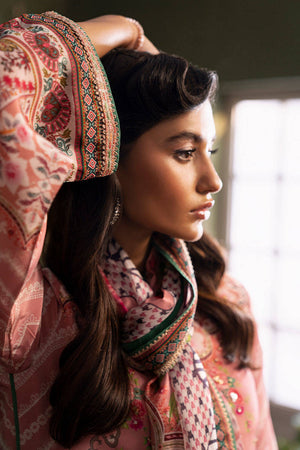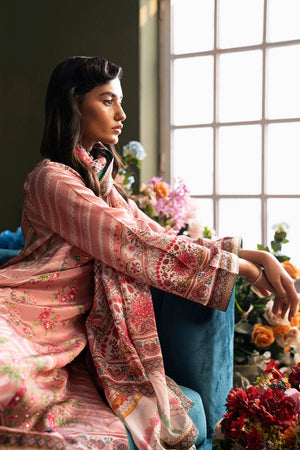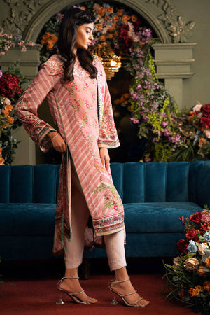 A stunning powder pink digital printed long shirt with embellishments all over the shirt with borders on neckline and hem. Paired with same color printed silk dupatta and completed with straight plain ivory pants.