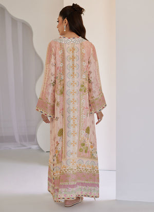 Our latest kaftan is a confection of charm — drenched in sugary hues of ivory and pale pink, and splashed with whimsical florals that feel like spring in motion. Cut from airy crepe, it flows effortlessly with every step, making it your go-to for instant impact with zero effort.