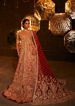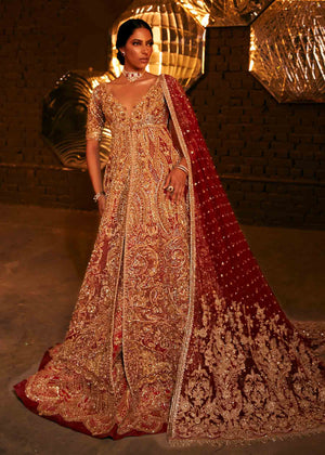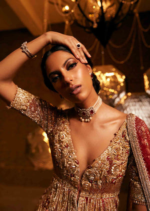Description: A contemporary take on the time honoured red bridal, Alcazar features hand embellishments with traditional techniques on a sheer net that create the perfect scarlet bridal. Three dimensional Mukesh and wasli are combined together to create this dreamy yet vogue take on the red bride. Completing the look is a fully jewelled red lehanga, hand embroidered with the old-world techniques and a sheer heavily embroidered net dupatta that gives the look it’s enchanting aura.
