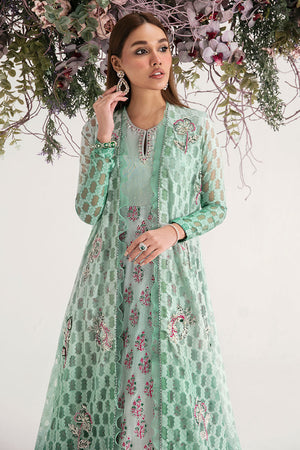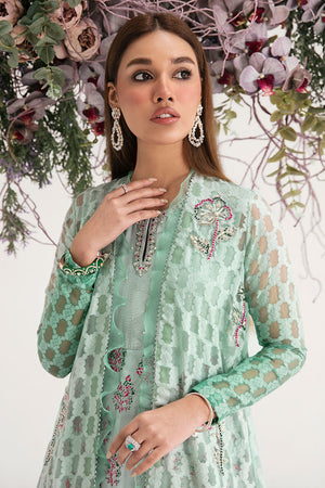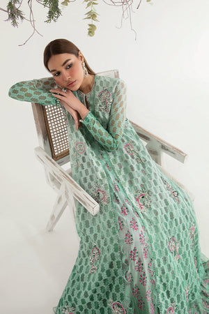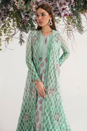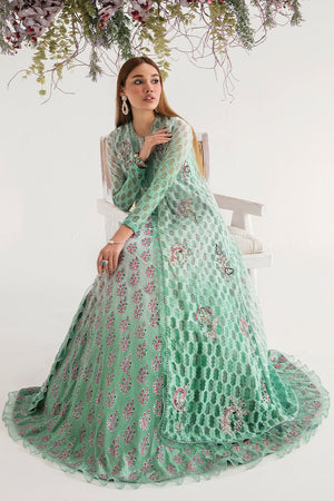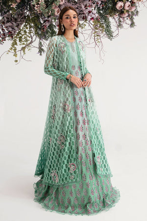This outfit is a perfect ensemble of mint green and raspberry colors. A floor length self organza gown with heavy floral motifs beautifuly hand crafted with zari, resham, sequins and tilla work. An organza ruffle with gota lace all over the gown. It comes with pk raw silk block printed frock with delicate hand zardozi work on the neckline enhanced with pearl, sequins and Swarovski spray on the bodice.
