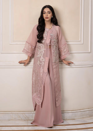 Description: Introducing Nur, a combination having layers of decadent buttermilk toned fine self printed organza, amalgamated with tikki stones, luminous sequence, exotic leaves and pearls ensembled with mixed lace, paired with either cowl dress or a straight slip with palazzo pants to enhance your style to the next level.