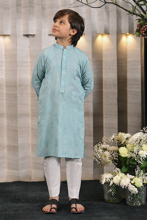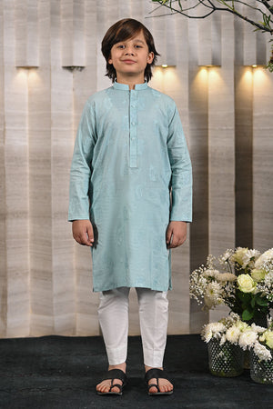 A striking turquoise blue kurta with intricate self-embroidery, paired with classic white pants.