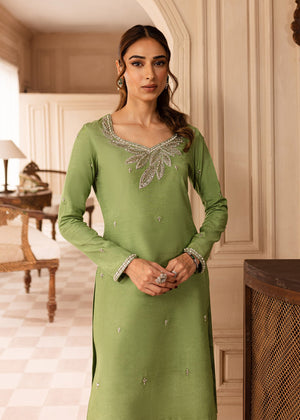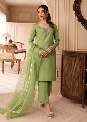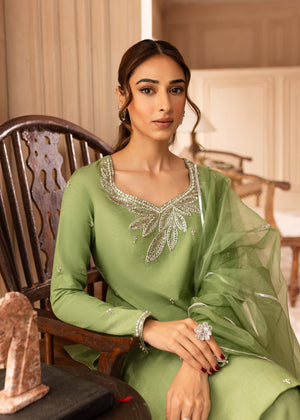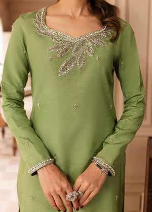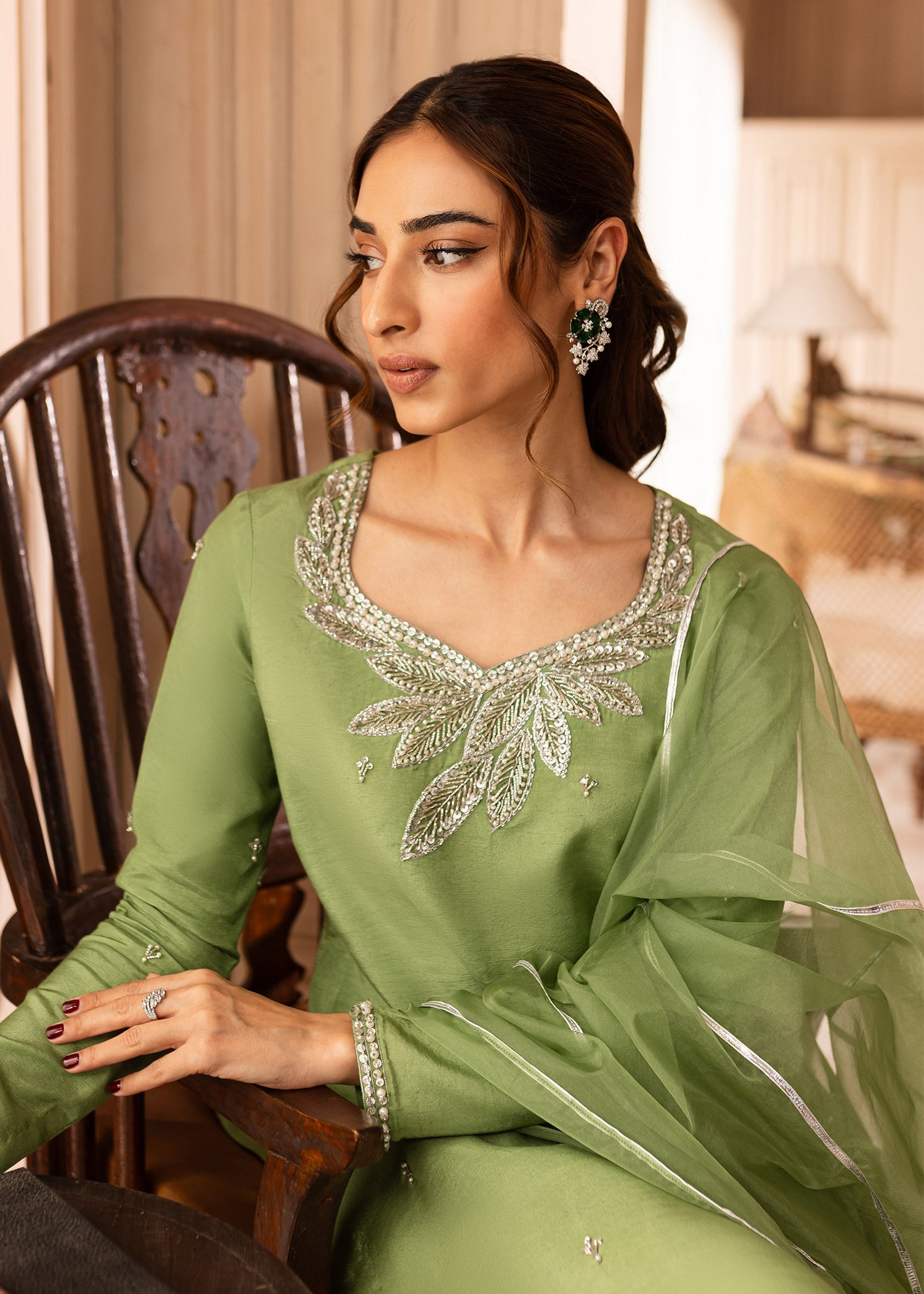 A decent Sage Green raw silk Embellished shirt with details of Silver Pipe, sitara, pearl and Nakshi. This medium length shirt is paired with straight pants and Organza dupatta with gota details. The look is perfect for a very chic and feminine allure.