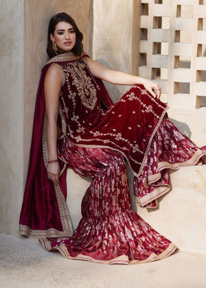 Aline is a rich and regal ensemble, designed to make a statement at any occasion. This deep maroon sleeveless shirt, crafted from luxurious velvet fabric, is beautifully accented with hues of gold,creating a stunning contrast that catches the light. The outfit is paired with a three-layered tissue silk sharara, adding volume to the silhouette, while the tissue silk dupatta completes the look with elegance. The piece is mounted with an intricately embellished details on the shirt with dabka, kora, sequins, pearls and crystals making Aline the perfect choice for a sophisticated, intimate event where every detail matters