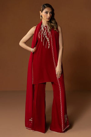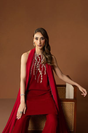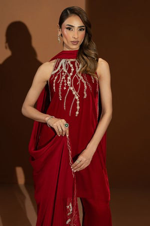 Achieve an ethereal charm in this deep red velvet outfit. The short shirt is beautifully detailed with intricate embellishments around the neckline, showcasing refined at its finest. Paired with elegantly tailored boot-cut pants and a fluid medium silk dupatta detailed along the borders, Allure is a true reflection of modern grace.