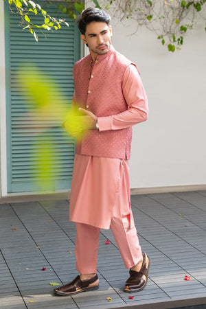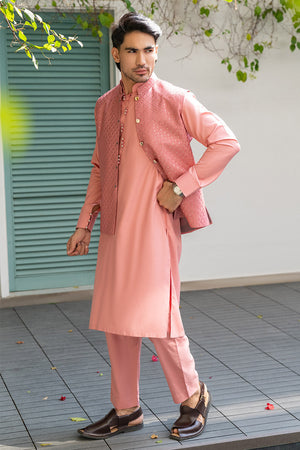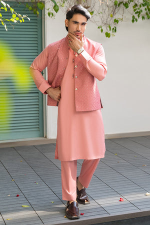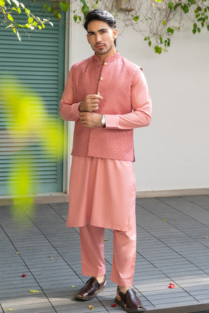 Introducing a refined ensemble featuring a waistcoat crafted from embroidered raw silk, complemented by a wrinkle-free polycotton shirt and matching pants. This outfit blends elegance with practicality, making it ideal for formal occasions. The intricate embroidery on the waistcoat adds a touch of luxury, while the polycotton fabric ensures a neat and polished appearance.