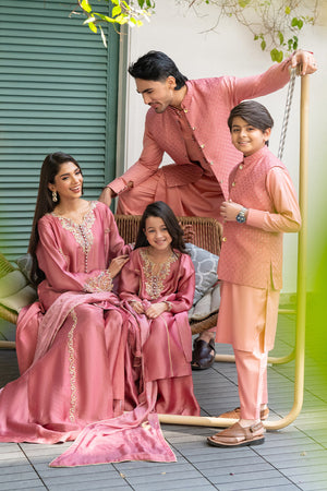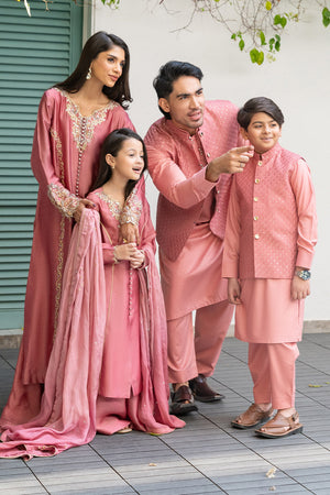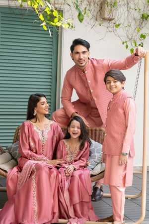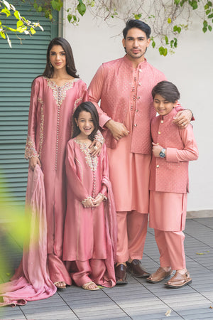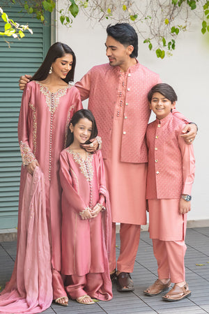 Introducing a stylish ensemble featuring a waistcoat made from embroidered raw silk, complemented by a wrinkle-free polycotton shirt and matching pants. This outfit combines elegance and practicality, making it perfect for formal occasions and events. The exquisite embroidery on the waistcoat adds a touch of luxury, while the polycotton fabric ensures a crisp, polished appearance.