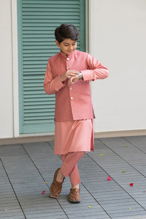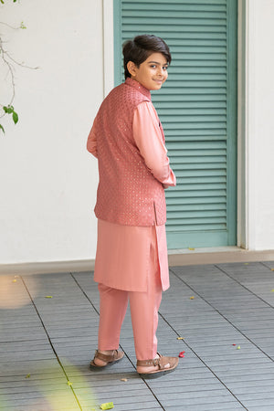 Presenting a refined ensemble featuring a waistcoat crafted from embroidered raw silk, complemented by a wrinkle-free polycotton shirt and matching pants. This outfit elegantly combines sophistication and comfort, perfect for formal occasions. The intricate embroidery on the waistcoat adds a luxurious detail, while the polycotton fabric ensures a neat and polished appearance.
