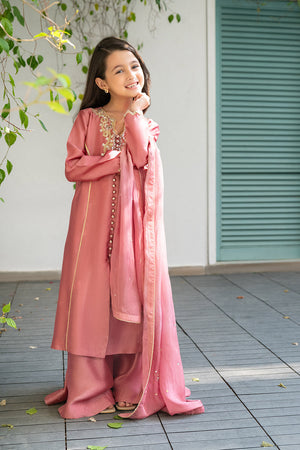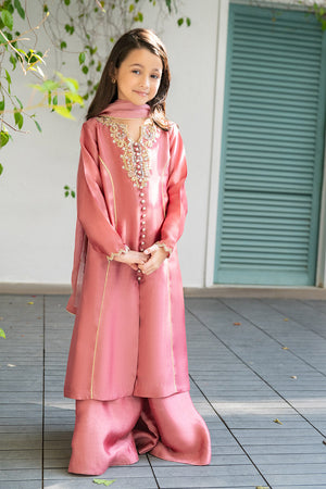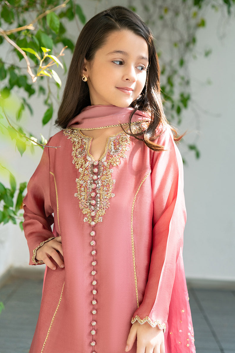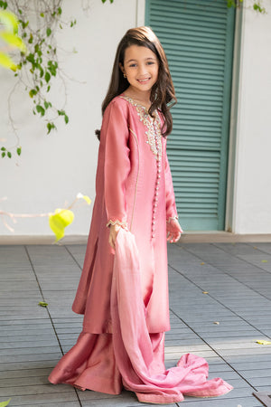 Draped in a soft and graceful almond pink hue, this exquisite ensemble is crafted from pure sheesha silk for both the shirt and pants, exuding a regal charm. The look is elevated with a stunning ombre medium silk dupatta, delicately sprinkled with sequins for a luminous touch.