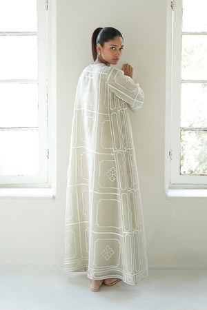 A serene ivory hued kaftan exuding understated sophistication is adorned with geometric tonal embroidery and delicate floral accents. The relaxed silhouette enhances its minimal yet refined appeal.