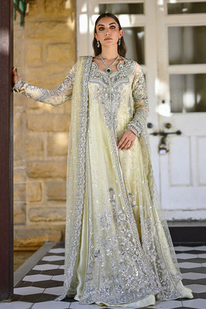 A soft pastel lemon yellow ensemble, featuring a sheesha silk fish kalidaar inner and a net front-open jacket with high side slits. The neckline and back are detailed with elegant cutwork. Embellishments include sequins, 3D organza leaves, cutdana, Swarovski stones, and pearls. It is paired with a net dupatta showcasing matching embellishment and delicate detailing.