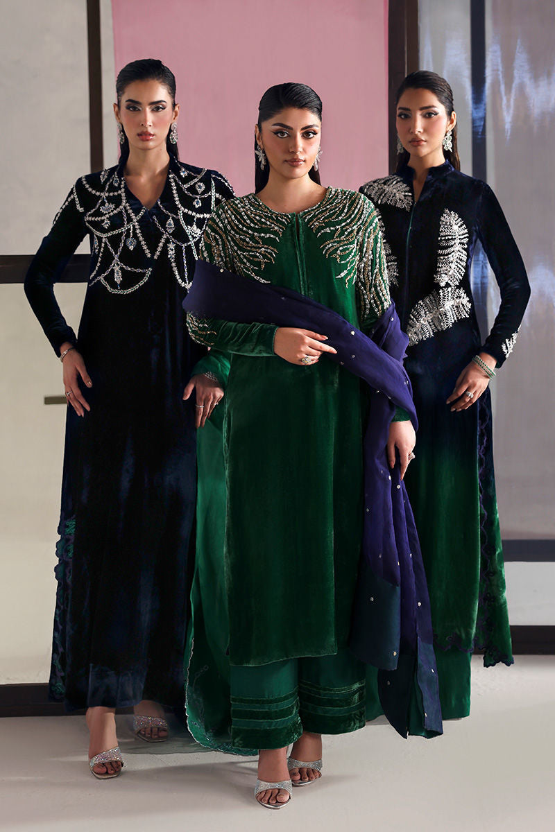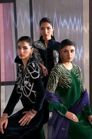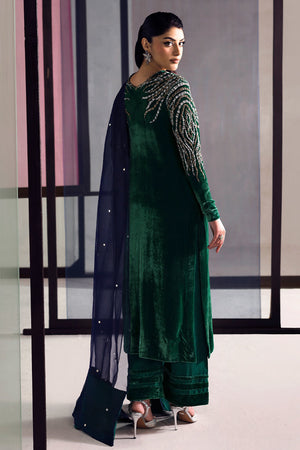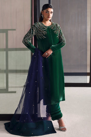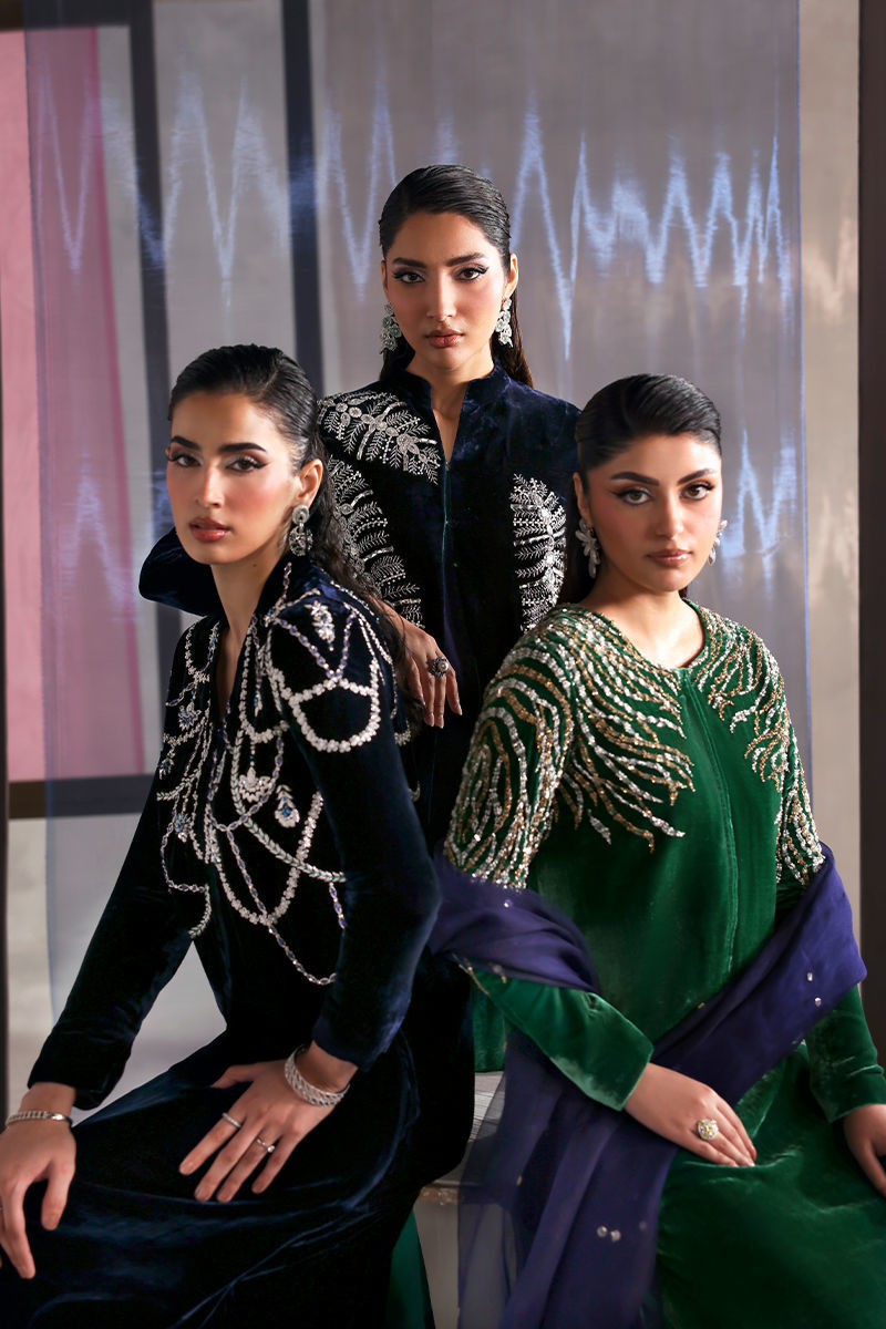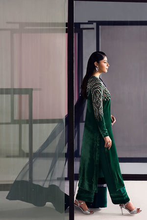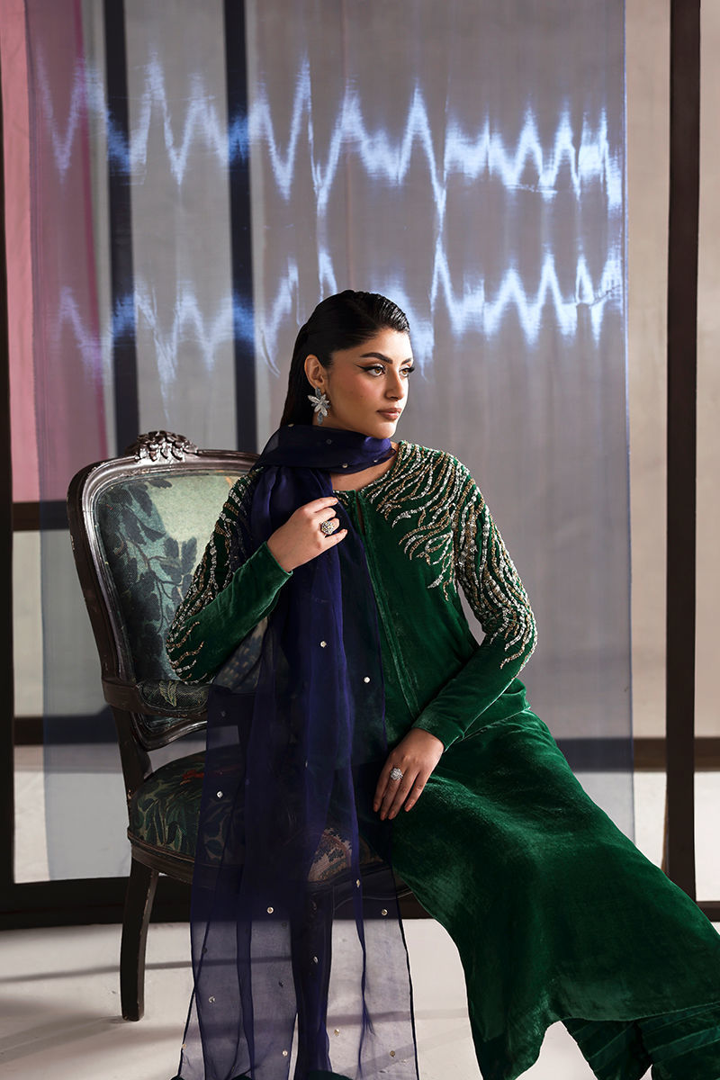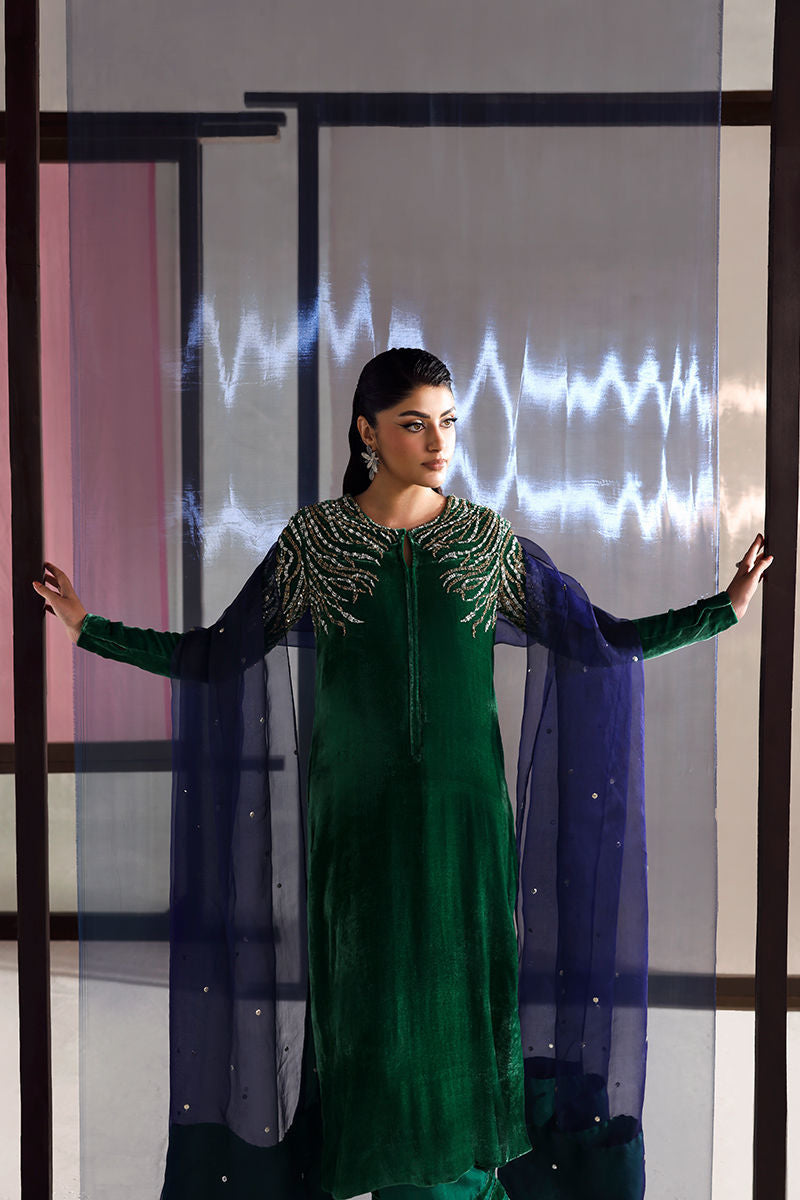 A sophisticated green ensemble featuring a pure velvet shirt paired with Korean raw silk azar pants. The look is completed with a pure organza dupatta, adding a soft and graceful finish to the rich, luxurious outfit