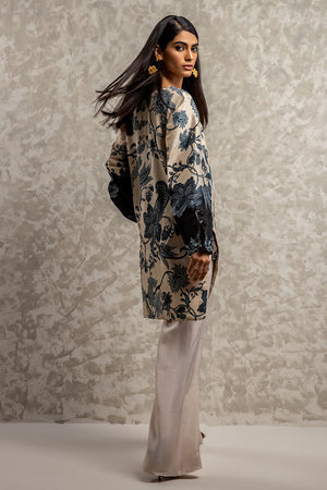Short straight silhouette print on silk fabric beautiful black and white floral print on light coffee colour canvas with printed gold galla delicate handcrafted zardzozi work motif appliqued on the galla intricate antique gold tila embroidery lace on the armhole and finished with thin velvet lace. Can be paired with pants as shown in the picture.