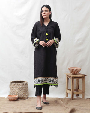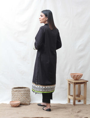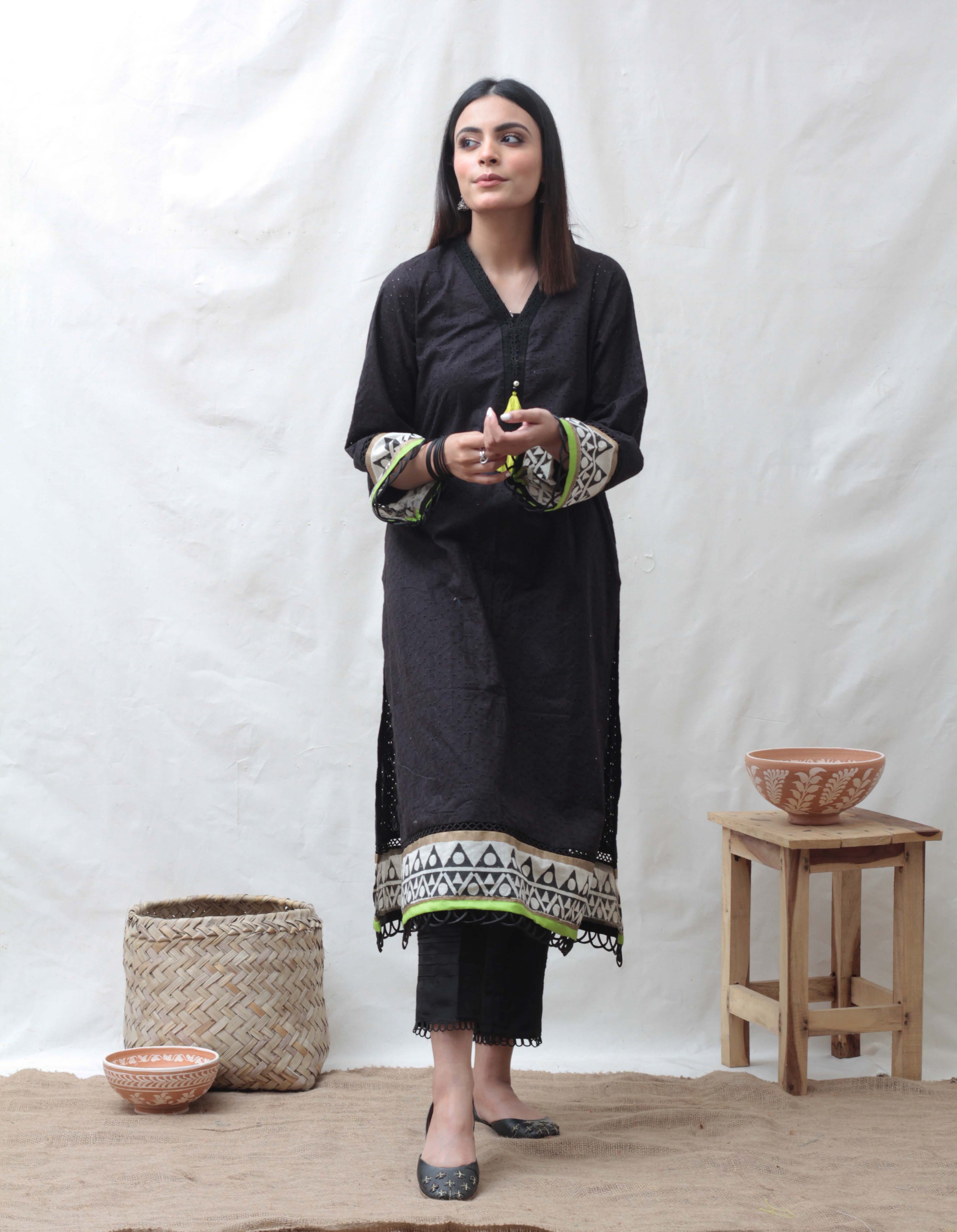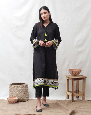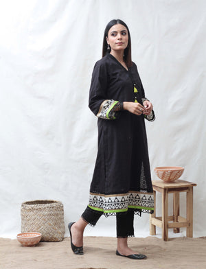 A neatly stitched chicken shirt with block print border on sleeves and hem with a hint of Neon green to make it stand out. Can be paired with a straight laced trouser