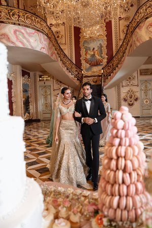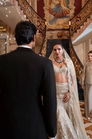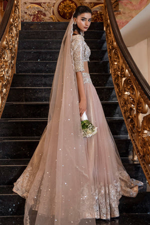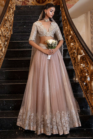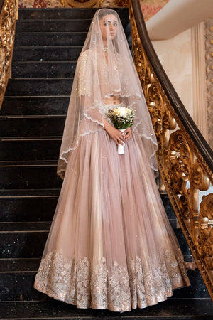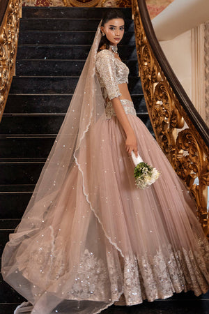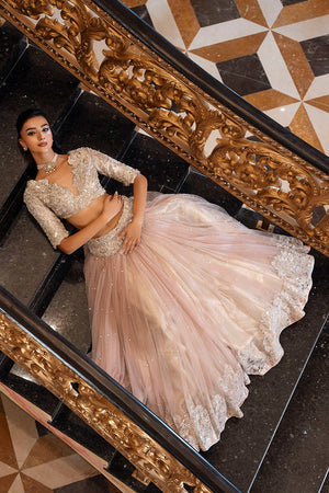 An elegant powder pink and ivory net lehenga, delicately adorned with pearl detailing, embroidered borders and embellished belt. The layered skirt adds graceful volume, giving it the charm of a modern silhouette. Paired with a tissue choli, hand-embellished and designed with a flattering “V” neckline and classic Indian sleeves, the ensemble exudes a youthful yet refined appeal, perfect for any wedding guest. A matching net veil with scalloped detailing completes the look, keeping it minimal yet timeless, while enhancing its overall sophistication.