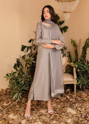 Amber, made on a soft bed of Silk. This graceful grey silk set features a boat neckline adorned with glamorous stone work, the sleeves are heaving embellished with sequins,stones and cut dana. Comes with a shiny organza dupatta. Perfect for all your day and night forrmal events!