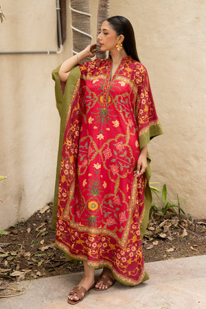 Find your coastal retreat in the Amila Kaftan. This vibrant red kaftan boasts eastern floral motifs, artful patterns, and a relaxed silhouette, crafted from airy khaddi silk.