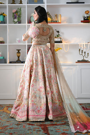 A Fawn Raw Silk Lehenga, its delicate fabric whispering tales of luxury. The digital print lehenga, adorned with vibrant floral motifs, offers a lively contrast to the subtle sophistication of the fawn hue. The choli features a flattering sweetheart neckline and traditional Indian sleeves, meticulously hand-embellished with gota, sequins, Swarovski stones, dabka, nakhsi, kat dana, and moti, accented with delicate resham knots. The ensemble is completed with a fawn stiff net dupatta, showcasing a stunning three-color ombré on both pallus and scalloped borders, adding a touch of modernity to this timeless piece.