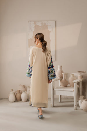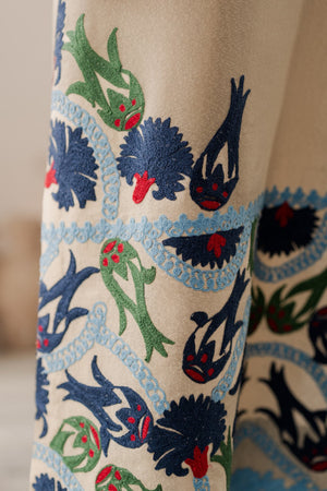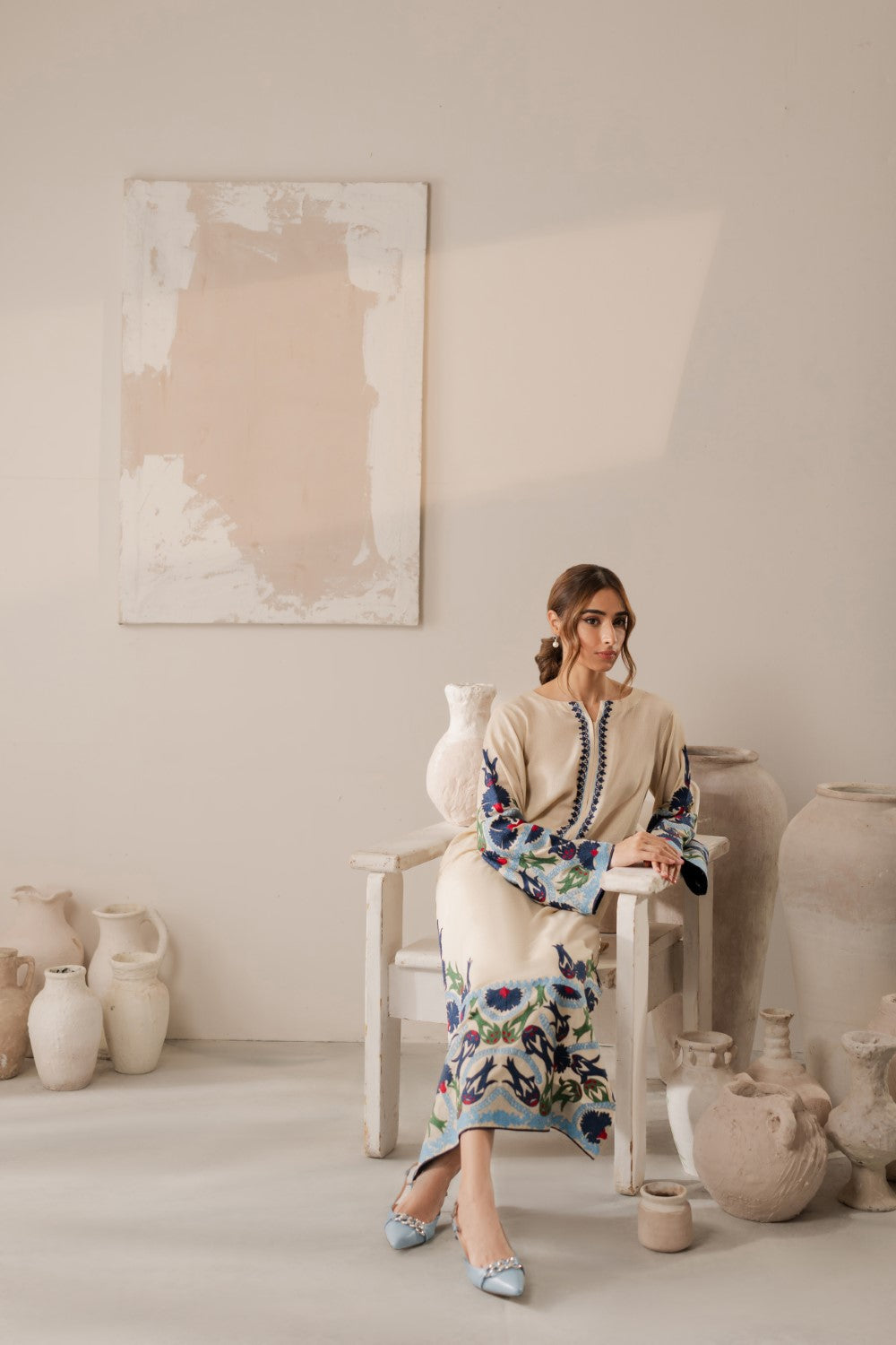 Mesmerising marine life colors come to life on an off-white karandi shirt, featuring a relaxed A-line silhouette. A timeless staple with a subtle irreverence introduced through striking royal blue embroidered Turkish floral motifs and embroidered details. Paired with straight pants and featuring a royal blue chiffon dupatta (that can be added separately).