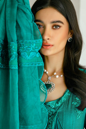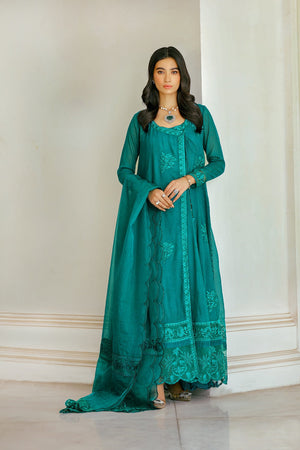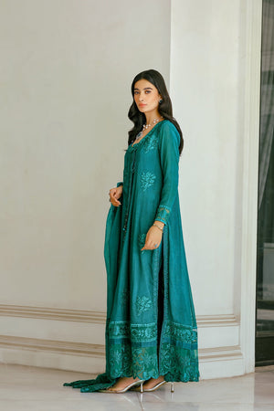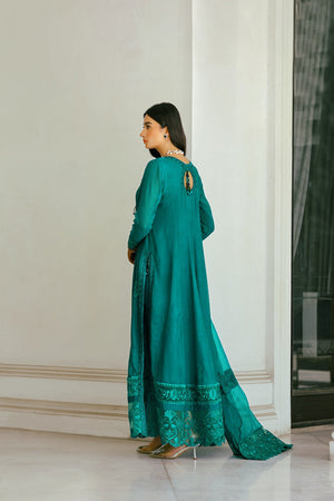Introducing our exquisite Teal Green Angrakha from our Eid Festive Collection. Crafted from cotton net fabric and embroidery details, this captivating ensemble exudes elegance. Adorned with delicate tassels that adds a charming touch. Paired with rawsilk straight pants and an organza dupatta featuring embroidered borders. this outfit is perfect for adding grace to your Eid celebrations.