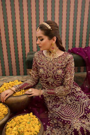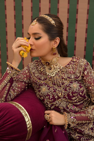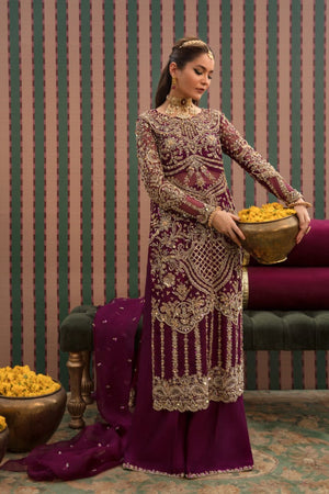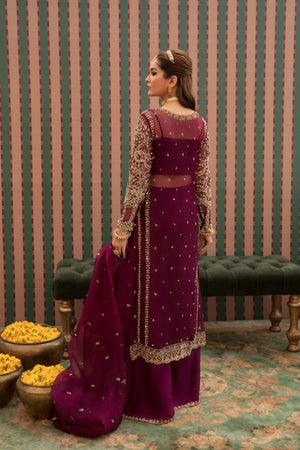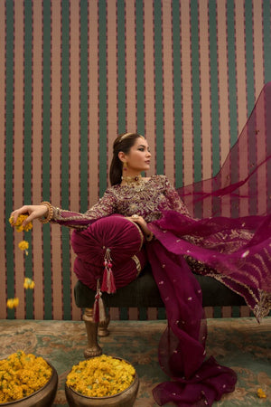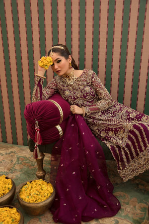 Introducing our magnificent plum hand embellished outfit in a deep and regal plum shade, is a beautiful piece of art. The elaborate embellishments on shirt, sleeves, and dupatta; producing a beautiful pattern that catches the light with every movement. These luxurious embellishments give an ensemble a touch of elegance, making it ideal for formal occasions. It is exquisitely combined with flared pants and a stunning dupatta to create an incredible attire that oozes elegance and refinement.