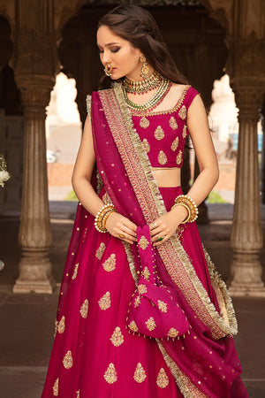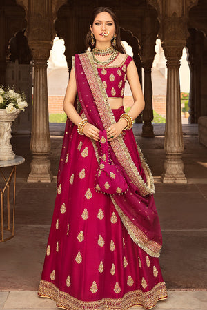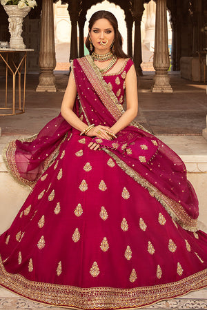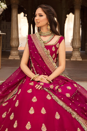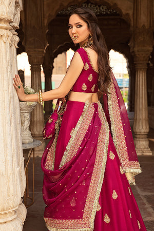The gorgeous, Anarkali is beautifully rendered on Korean silk, with a silhouette of lehnga choli. The motifs are lavishly scattered with zardozi work and sequins. The outfit is perfectly paired with mukesh organza dupatta, with all four sided embellished border.