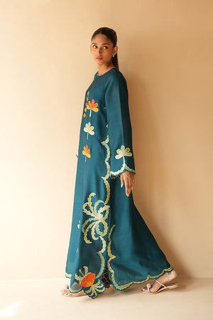 A vibrant teal hued ensemble in fine organza is embroidered with playful applique and resham details in vibrant tangerine and verdant green tones. The silhouette is accentuated with a scalloped hemline and flared sleeves, exuding artisanal charm.