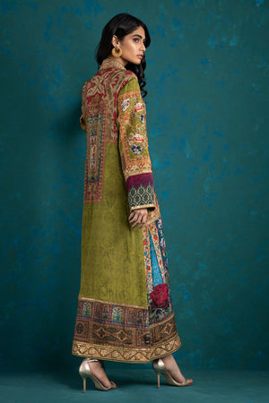 Simple yet elegant traditional straight kurta detailed print on silk fabric design inspired by Turkish Art and textiles with outline of antique tila thread to enhance the print. Delicate handcrafted galla patti created with zardozi work intricate Mughal inspired motifs made with resham thread and zardozi work appliqued on the shirt. The shirt is finished with antique tila thread and sequins lace.