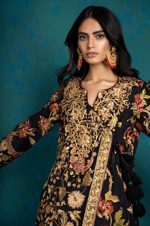 Front open angrakha silhouette fully embroidered shirt on silk fabric handcrafted antique tila thread, resham thread and sequins embroidery beautiful embellished antique gold galla intricate handcrafted zardozi work on front open patti finished with digital print border. Shirt is paired with digital printed stole and pants can be added seperately.