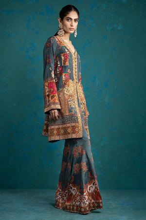 Front open shirt silhouette Mughal floral and carpet inspired print on silk fabric print is enhanced with antique gold tila thread beautiful intricate handcrafted work created with sequins, dapka, naqshi, tila thread, gota and golden beads on the shirt. The shirt is paired with beautiful printed and outlined pants. Stole can be added seperately.