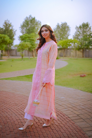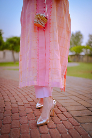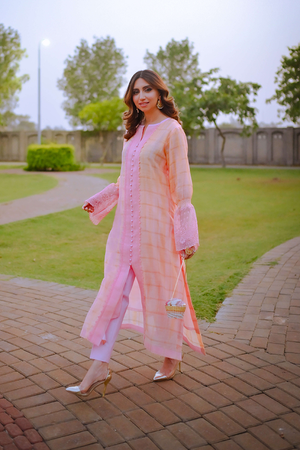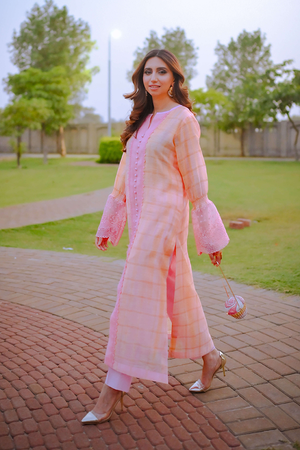 The perfect shades of pink and peachy hues brightening your day. Our “Anna” cotton two-piece dress is a beautifully crafted long shirt, paired with statement organza sleeves and straight trousers, redefining your summer look.