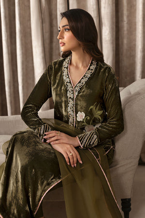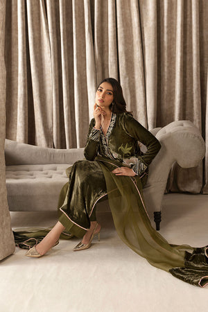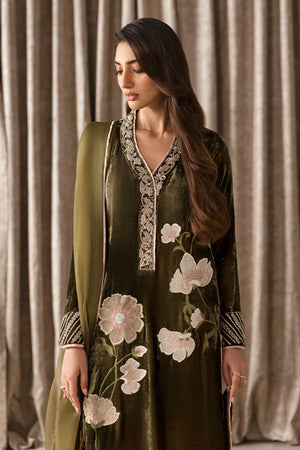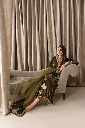 Beautiful thread floral embroidery in front on pure olive green velvet. Intricate hand embroidery on neck and sleeves. It is paired with organza and velvet dupatta.