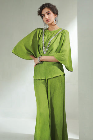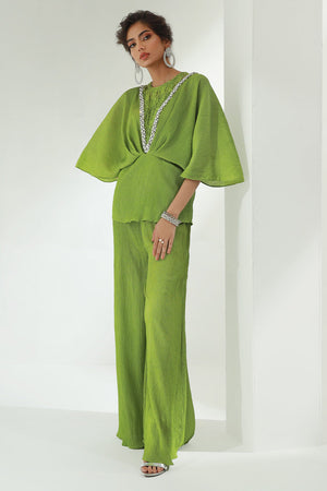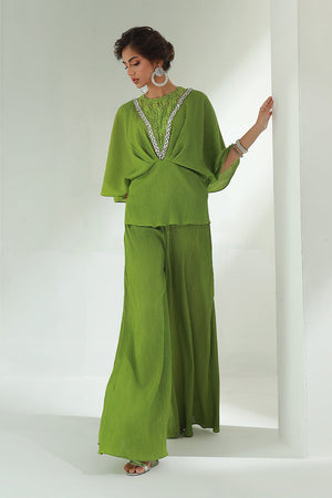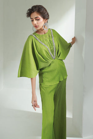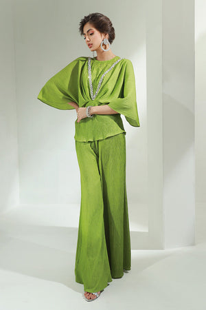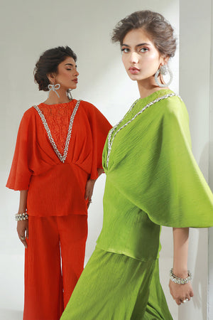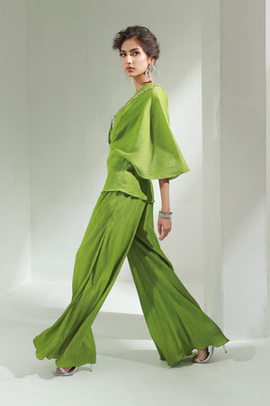 The striking Neon cape ensemble is expertly constructed using crushed fabric, introducing an element of dramatic flair. Its neckline is adorned with delicate lace fabric and enhanced with diamond-cut stones and pearls, culminating in a captivating look. Complementing this ensemble are flared pants, making it a standout and essential addition to your fashion repertoire.