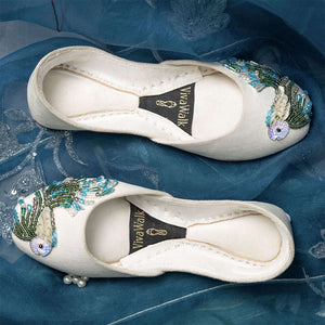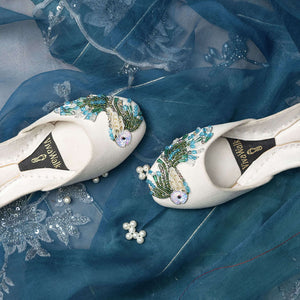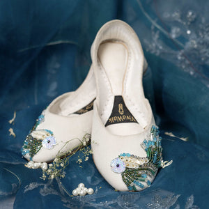 Step into elegance this Eid with ‘Aquatic Grace.’ Our latest khussa features intricate fish designs brought to life with 5 to 6 hours of exquisite handwork, including Aari work, beads, crystals, sequins, and naqshi details on luxurious white velvet. The leather bottom ensures comfort, making these the perfect blend of tradition and style for your festive celebrations.