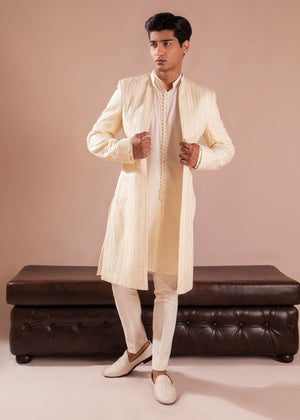 This sherwani features intricate embroidery that adorns the front, adding a touch of refined charm to your ensemble. The open design lends an air of modernity to this traditional garment, making it a versatile and stylish choice for various special occasions.