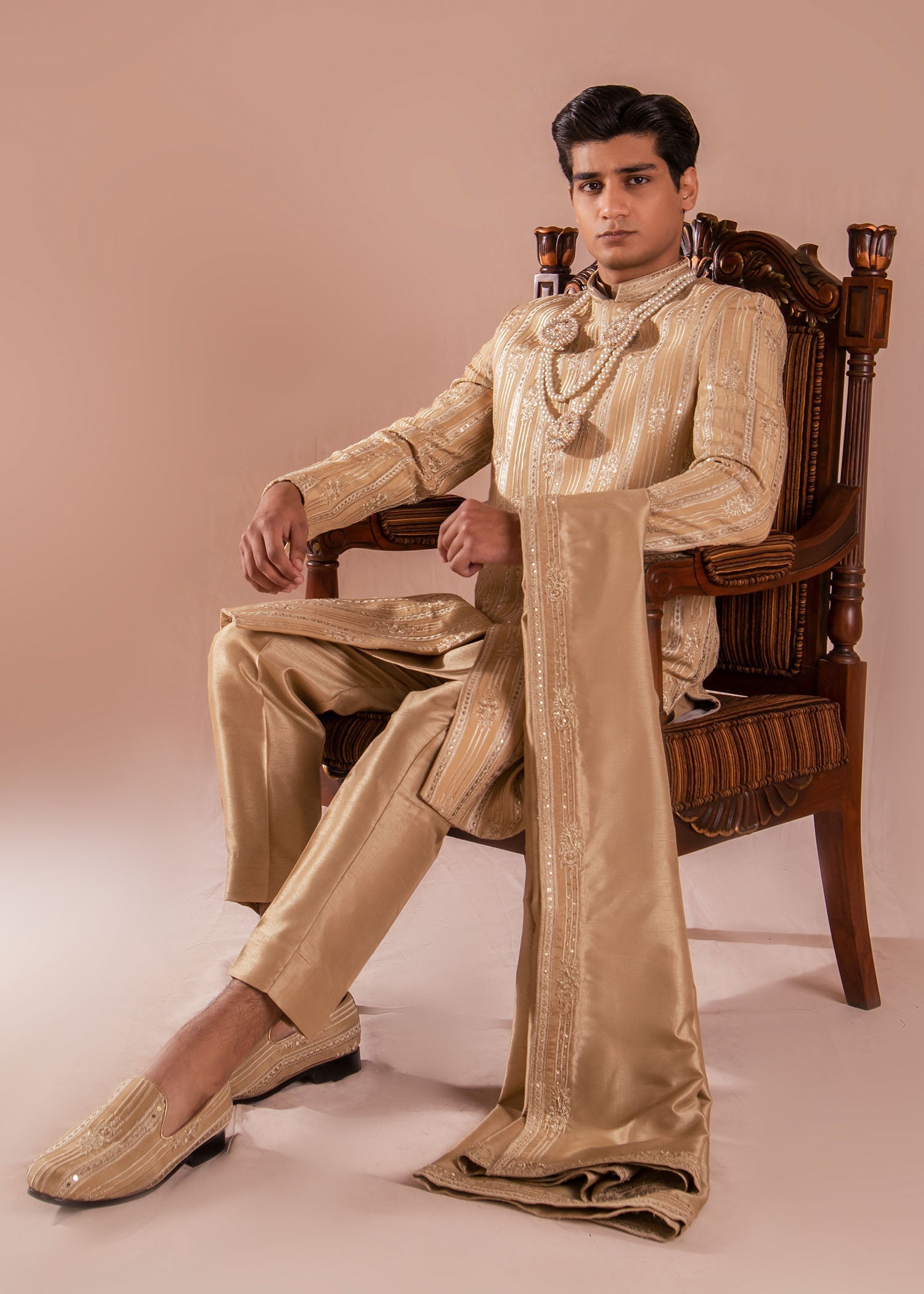 The luxurious sherwani is complemented by a matching silk shawl, exquisitely hand-worked for an extra touch of sophistication. The combination of the golden silk embroidery and hand sitara work on the sherwani, along with the handwork on the shawl, creates a stunning ensemble that's bound to make heads turn. To ensure your comfort throughout the event, the sherwani features a silk inner lining, providing a breathable and elegant fit.