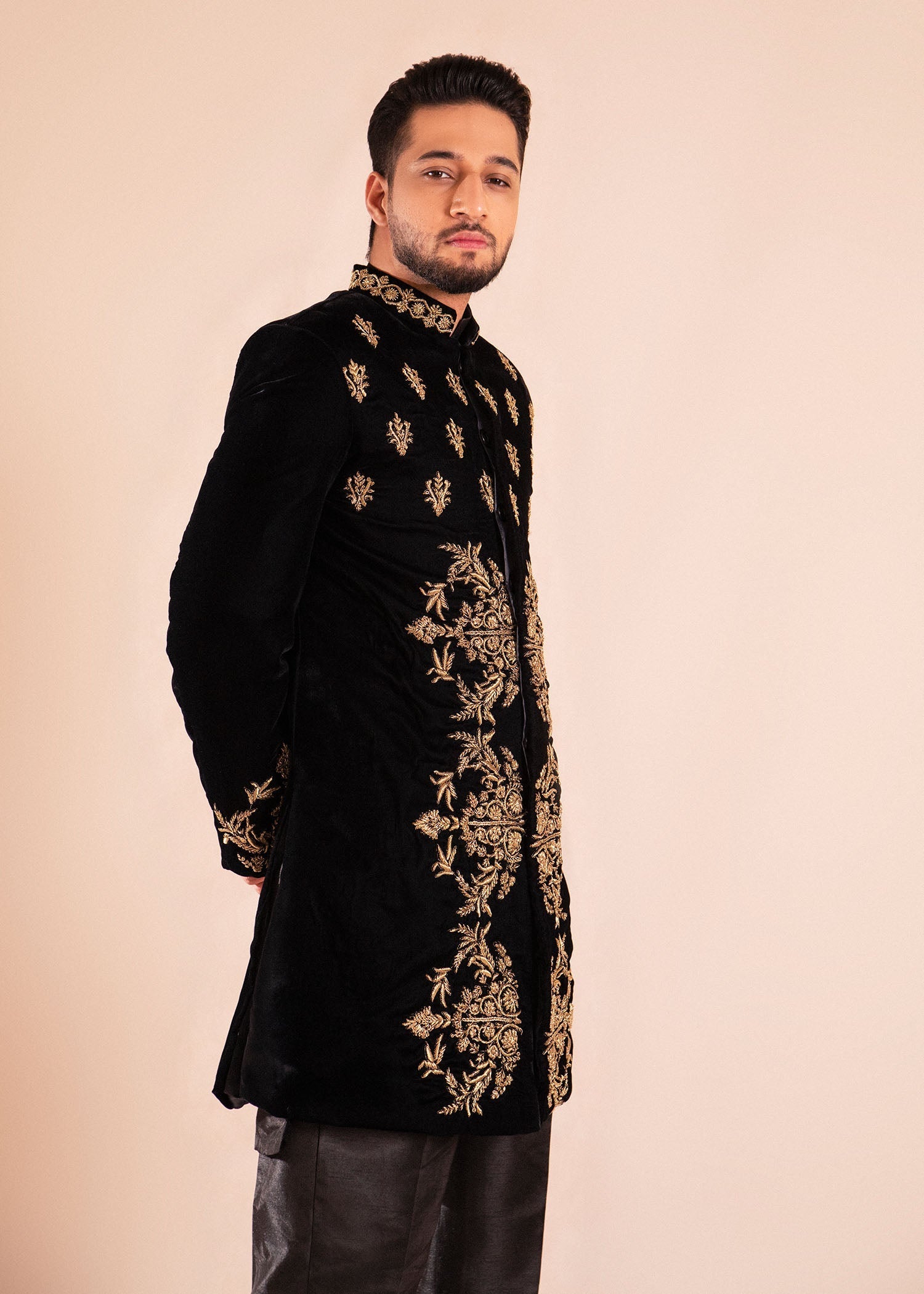 This opulent sherwani boasts intricate gold handwork of dapka and naksi, adding a regal touch to the rich black velvet. Its inner silk lining ensures not just comfort but an added layer of elegance, making it an ideal choice for special occasions where you aim to make a statement.