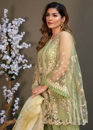 Description: Feel a different Vibe of net Pistachio Green open shirt embroidery with gold tila embroidery & white resham embellish hand work i.e Mirror, sittara, pearl etc Paired with crush sharara gold block print on border and tie n dye organza dupatta