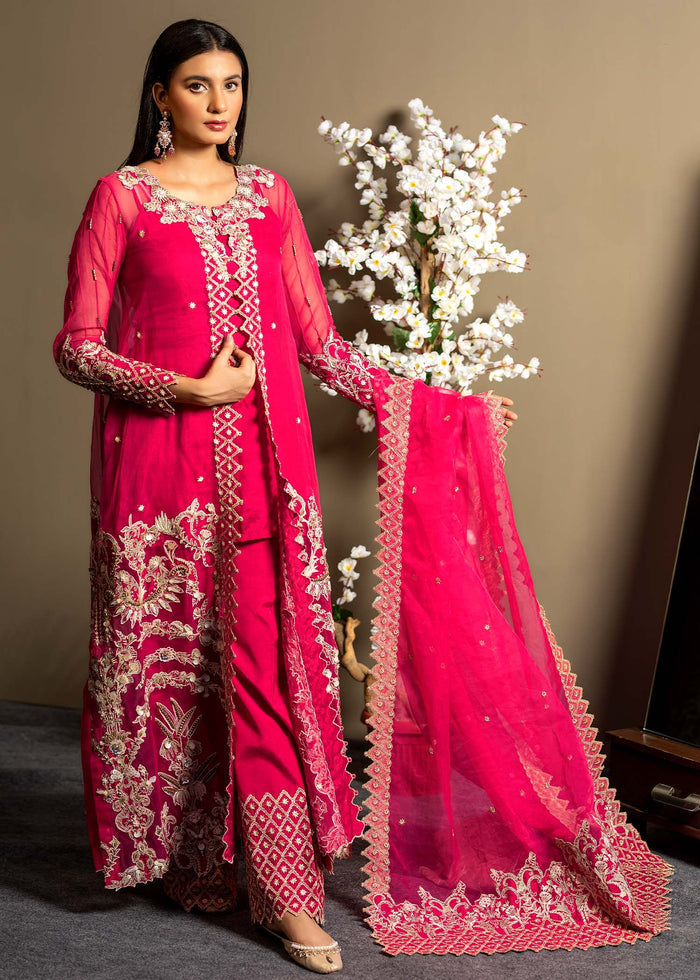 Description: Shocking pink front open gown embroidered and embellished on shirt's front and sleeves ,paired with embroidered border pant and embroidered border