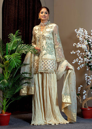 Description: A Ivory Organza open shirt ensemle dazzling with gold tilla , green and pink embroidery and hand work enhanced it look , paired with crush sharara