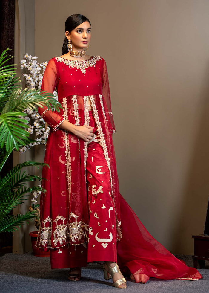Description: maroon organza Fornt open Frock shows eastern look with heavy embroidery and hand work with pearls,sitara,gota,etc on borders and sleeves and body