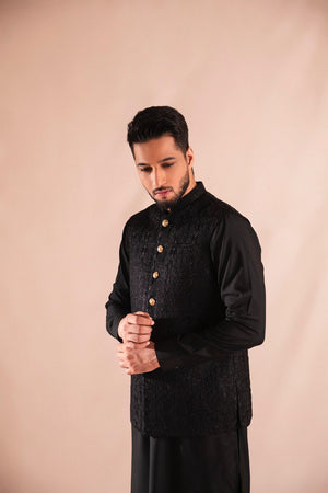 The image showcases a sophisticated ensemble perfect for a wedding or a memorable event. It features a wash & wear fabric waistcoat with matching thread embroidery and golden buttons, paired with a complementary wash & wear kurta pajama. The waistcoat adds a touch of refinement to the traditional outfit, making it ideal for special occasions. The coordinated embroidery and golden buttons enhance the overall look, creating a stylish and elegant attire suitable for a variety of celebratory events.