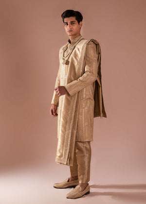 silk shawl, exquisitely hand-worked for an extra touch of sophistication. The combination of the golden silk embroidery and hand sitara work on the sherwani, along with the handwork on the shawl, creates a stunning ensemble that's bound to make heads turn.